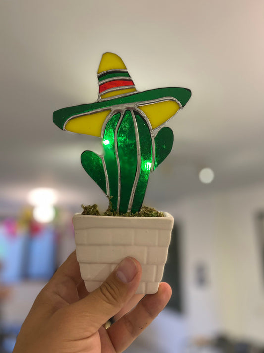 Buntglas-Kaktus mit Sombrero-Hut • Kaktus-Pflanzenstecker • Einzigartiges Geschenk